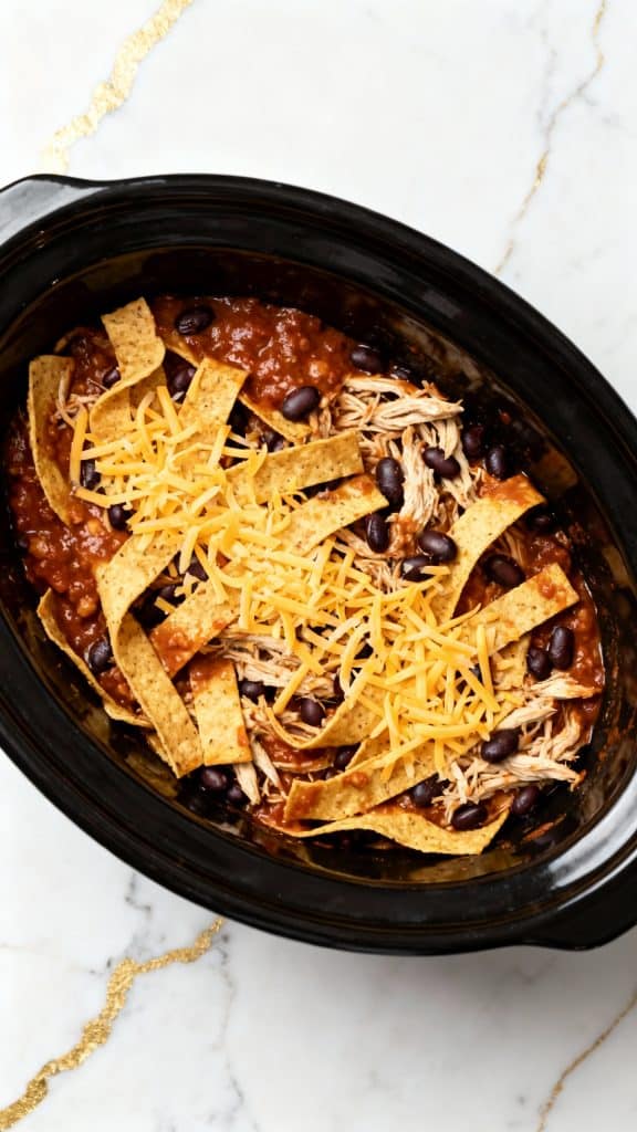 Stir in 4 corn tortillas (cut into strips). Sprinkle 1 cup shredded cheese evenly over the top. Cover and cook for another 30 minutes, until cheese is fully melte