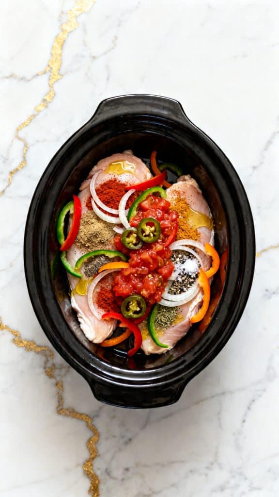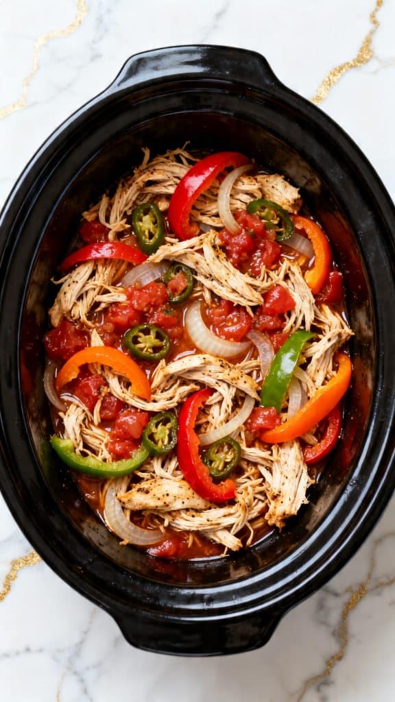 Cover the crockpot and cook on low for 3 to 4 hours or on high for 2 to 3 hours, until the chicken reaches 165°F and is tender enough to shred easily. The peppers should be softened, the onion should look silky, and there should be flavorful juices in the bottom.