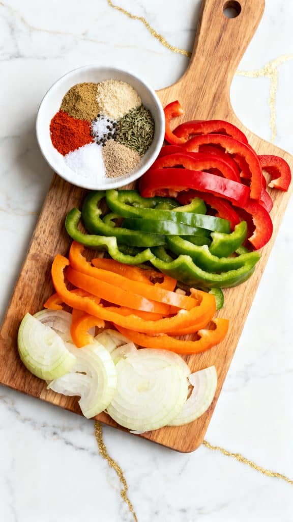 Thinly slice 1 red bell pepper, 1 green bell pepper, 1 orange bell pepper, and 1 medium onion. In a small bowl, mix 2 teaspoons chili powder, 2 teaspoons ground cumin, 1 teaspoon smoked paprika, 1 teaspoon garlic powder, 1 teaspoon onion powder, 1 teaspoon kosher salt, 1/2 teaspoon black pepper, and 1/2 teaspoon dried oregano until evenly combined.