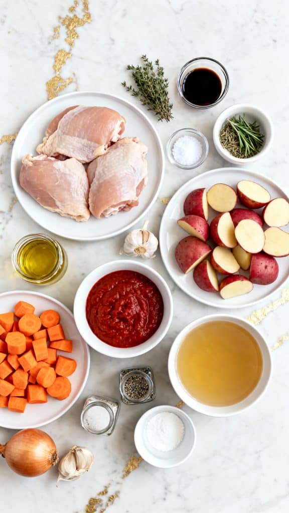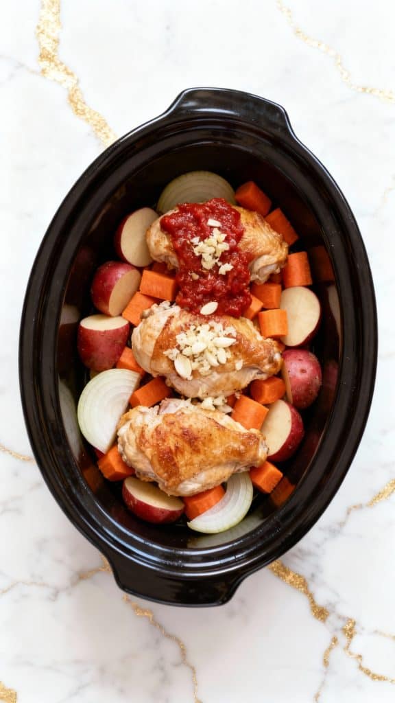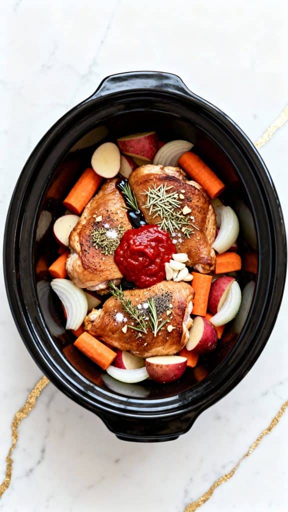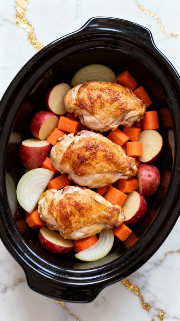 You just toss everything into the crockpot and let it do the work. The chicken thighs turn out fall-apart tender, and the veggies soak up all that good, savory broth.