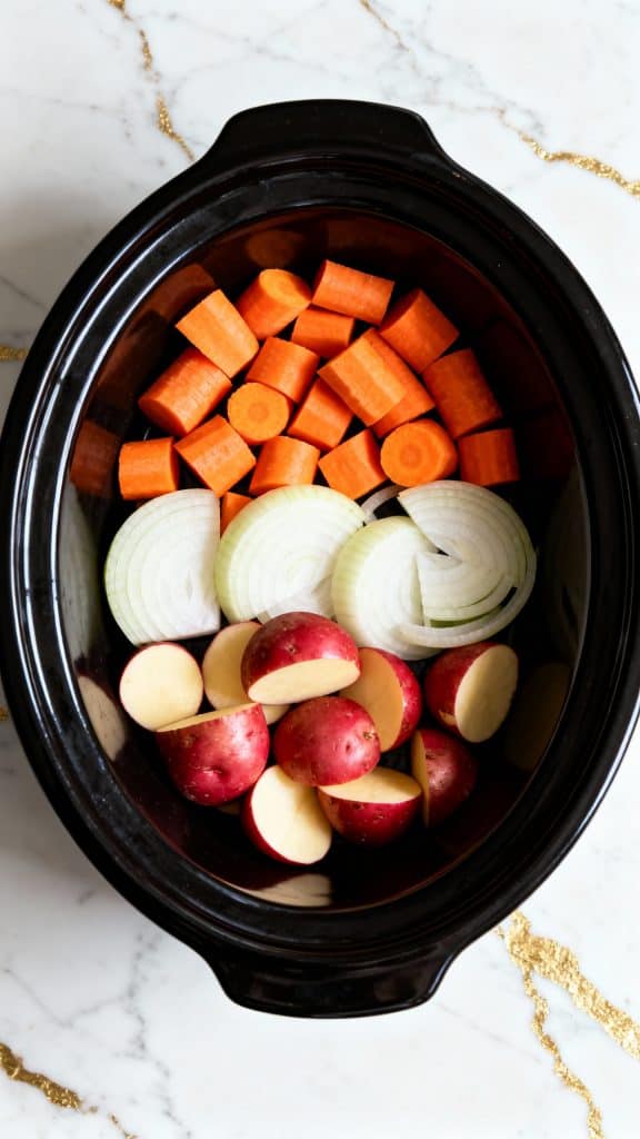 Add 4 chunked carrots, 4 quartered red potatoes, and 1 thick-sliced onion to the bottom of the crockpot.