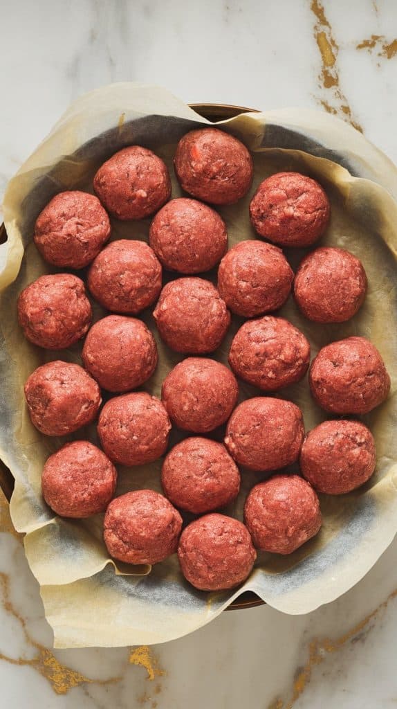 Use your hands or a scoop to form the mixture into about 20 equal-sized meatballs, placing them on a parchment-lined tray or plate.