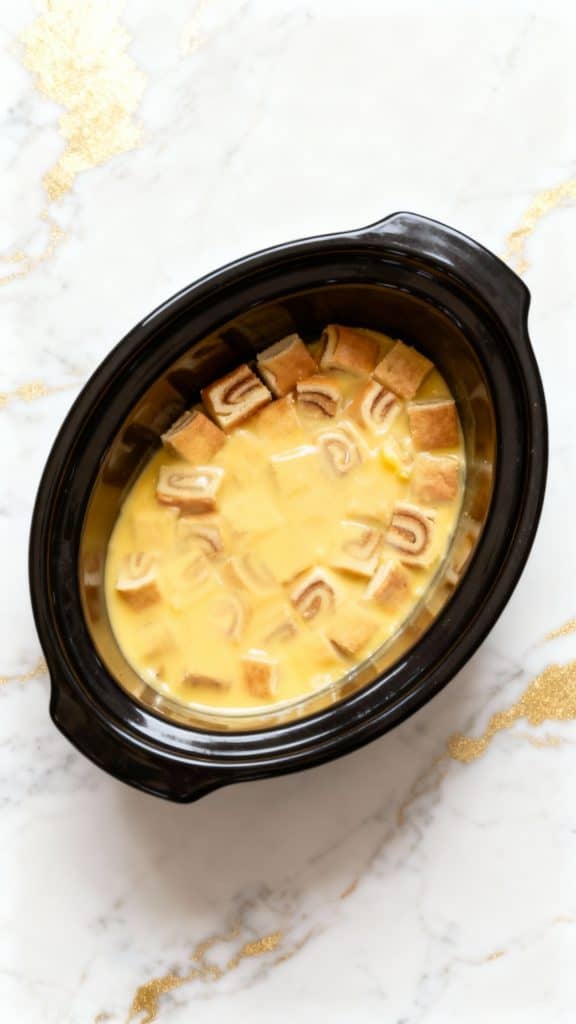 Pour the egg mixture evenly over the cinnamon rolls in the crockpot.