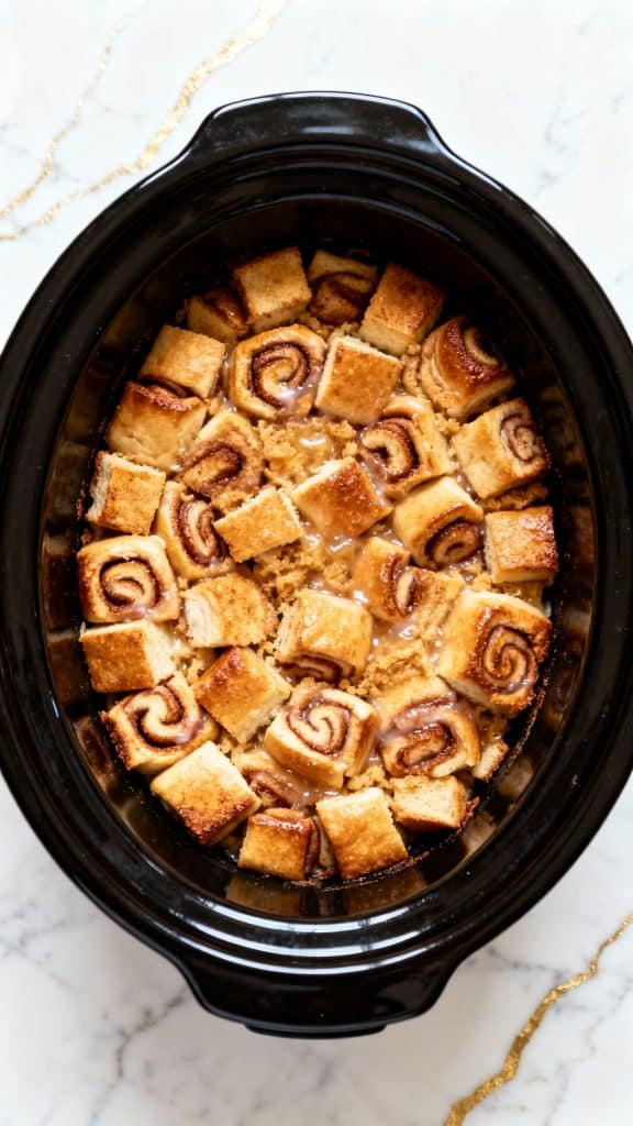 The eggs and cream mixture bakes around the cinnamon rolls, creating a custard-like base that keeps everything moist. The brown sugar caramelizes with the cinnamon, and the crockpot’s slow heat helps it cook gently and evenly without burning.