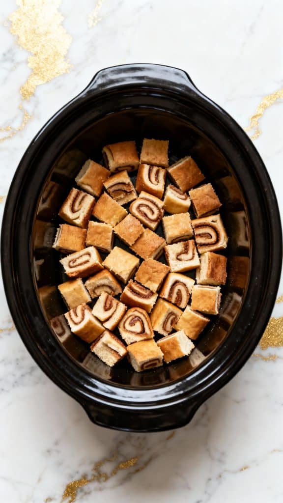 Place all the cinnamon roll pieces into the greased crockpot. Spread them out evenly in one layer.
