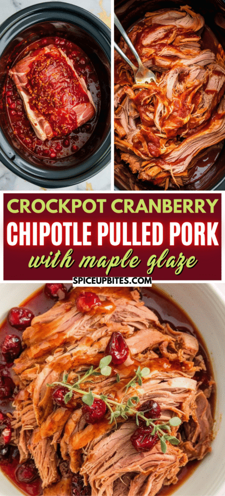Pork shoulder is a fatty cut, perfect for slow cooking — the collagen breaks down over hours, making the meat fork-tender. Cranberry adds acidity and sweetness, while the chipotle brings smoky depth. The final maple glaze adds a glossy finish and balances the heat. The combo of slow heat and acidity ensures maximum tenderness and flavor.