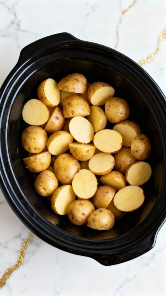 Add 1.5 lbs halved baby gold potatoes to the bottom of the crockpot.