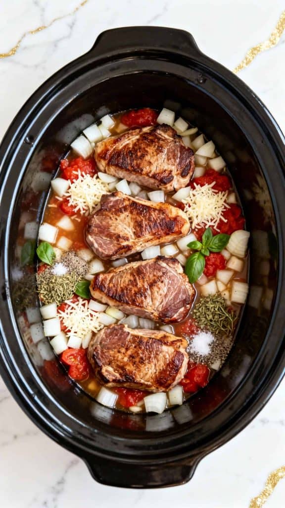 Pour in 1 (14.5 oz) can of crushed tomatoes, ½ cup of chicken broth, and sprinkle over ¼ cup grated Parmesan cheese. Add 1 small diced yellow onion, 4 minced garlic cloves, 1 teaspoon dried basil, ½ teaspoon dried oregano, ½ teaspoon salt, and ¼ teaspoon black pepper. Give everything a gentle stir to mix the flavors together.