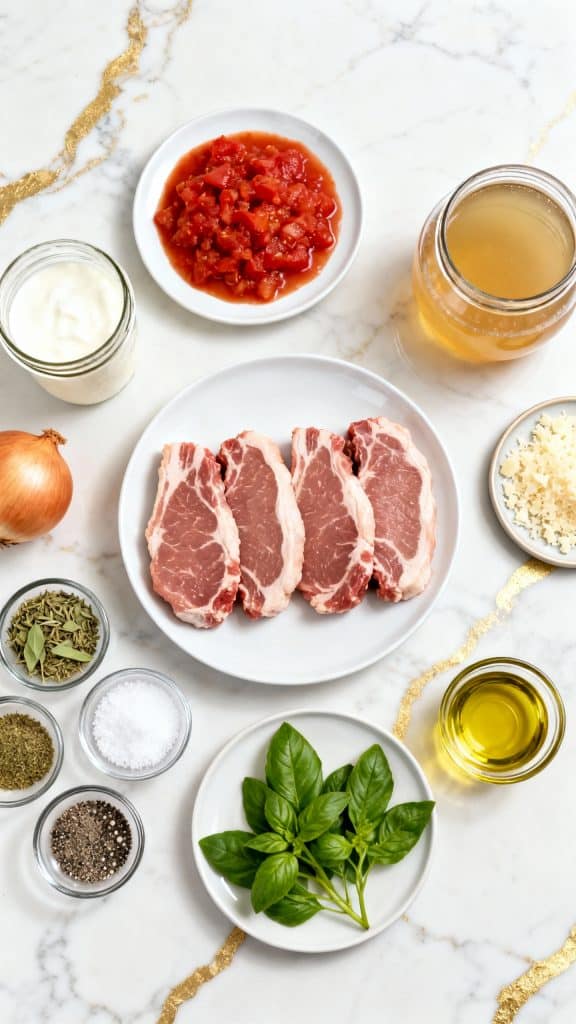 This is one of those meals that feels like a hug in a bowl. Creamy, tangy tomato sauce with a fresh pop of basil wrapped around juicy, tender pork chops—what’s not to love?