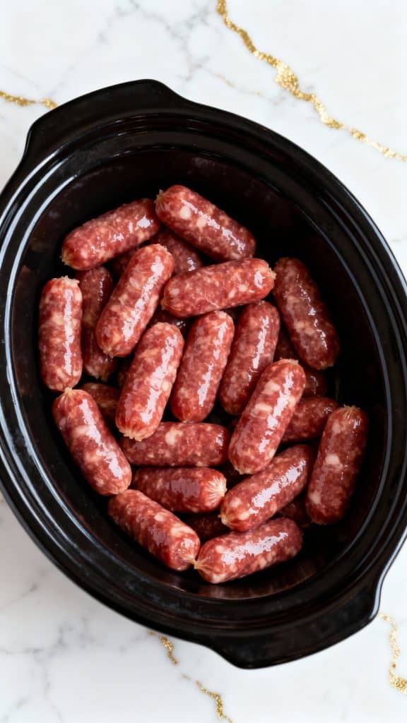 Pour the entire 14 oz package of beef little smokies into the black oval crockpot.