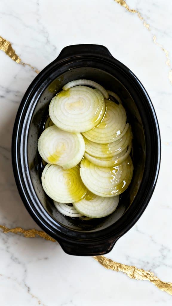 Drizzle 1 tablespoon of olive oil into the bottom of your crockpot. Then add all the sliced onions, spreading them out into an even layer so they cover the base completely.