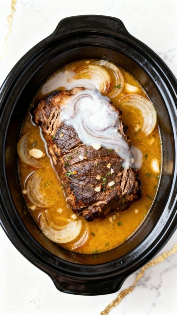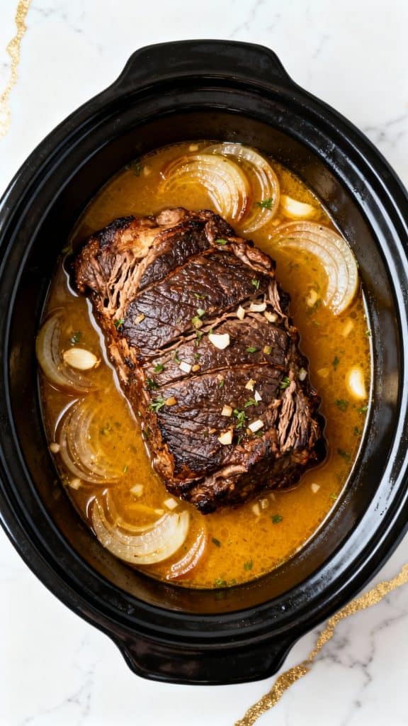 Use two forks to shred the roast directly in the crockpot or lift it out gently to serve whole. Spoon those soft, jammy onions and savory gravy over the top, and sprinkle with a little fresh parsley or thyme if you like.