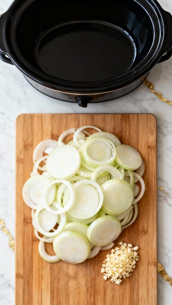 Step 2: Layer the onions in the crockpot