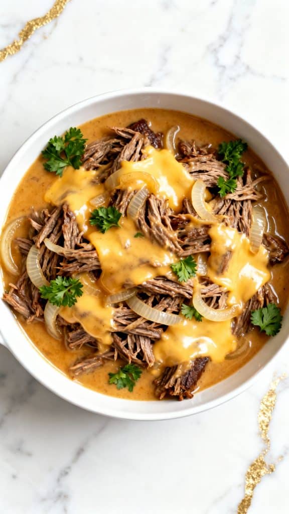 This recipe takes all the best parts of French onion soup—caramelized onions, beefy broth, melty cheese—and marries them with a tender, pull-apart pot roast that’s been slow-cooked to perfection. It’s rich, hearty, and full of comfort.