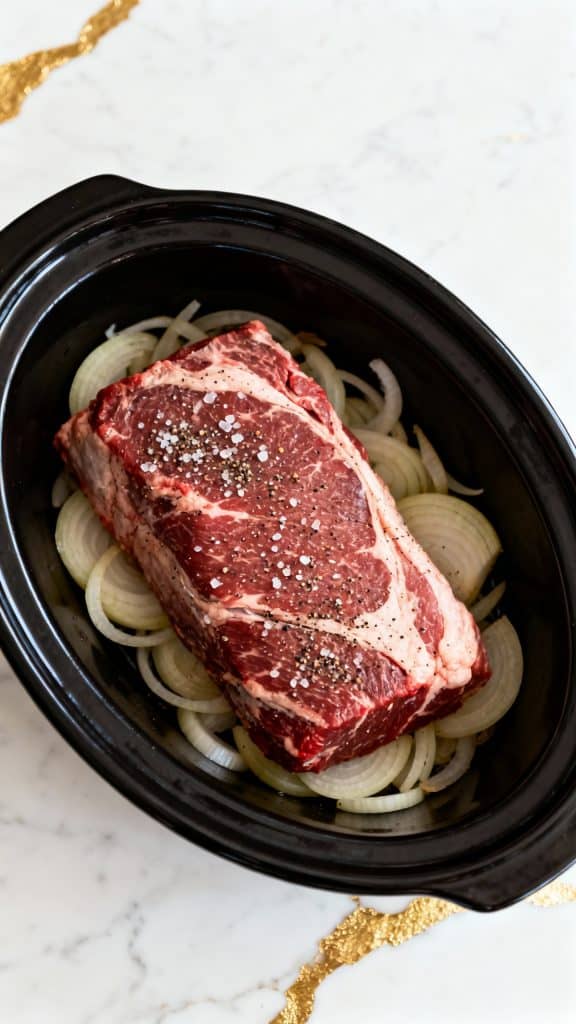 Place a 3-pound chuck roast right on top of the onions. Season the top of the meat with ½ teaspoon of kosher salt and ½ teaspoon of black pepper.