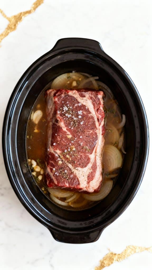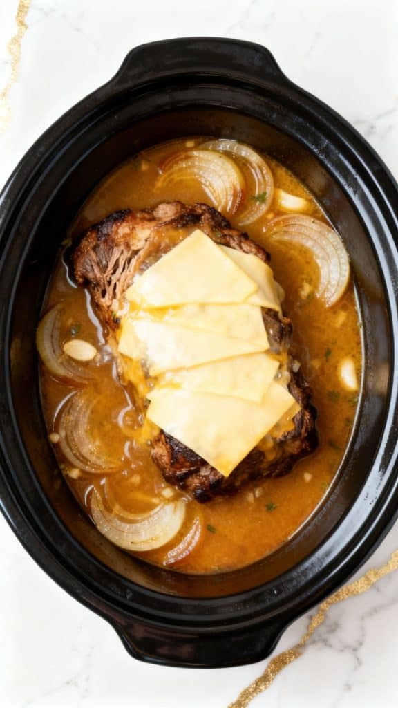 Top the roast with 6 slices of provolone cheese, right in the crockpot. Let it sit with the lid off (or just lightly covered) for 5–10 minutes until the cheese is melty, bubbly, and irresistible.