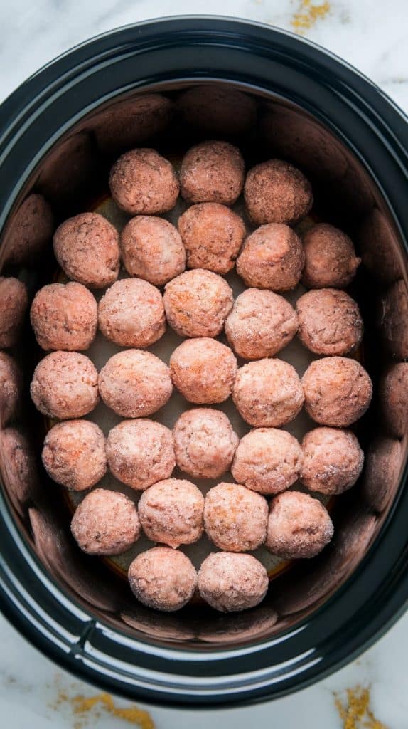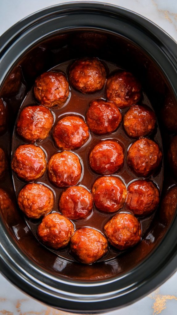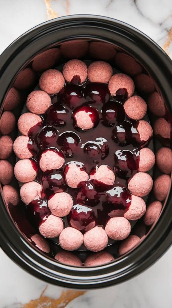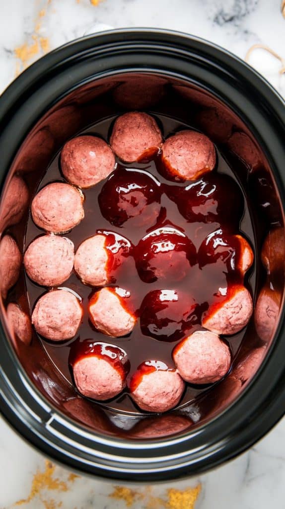Grape jelly gives the sauce its smooth, sticky texture and sweetness, while the BBQ sauce adds tang and spice. As the frozen meatballs heat up slowly, they release moisture that blends with the jelly and BBQ, turning into a perfectly balanced glaze. The slow cooker lets everything cook gently, so the flavors really soak in.