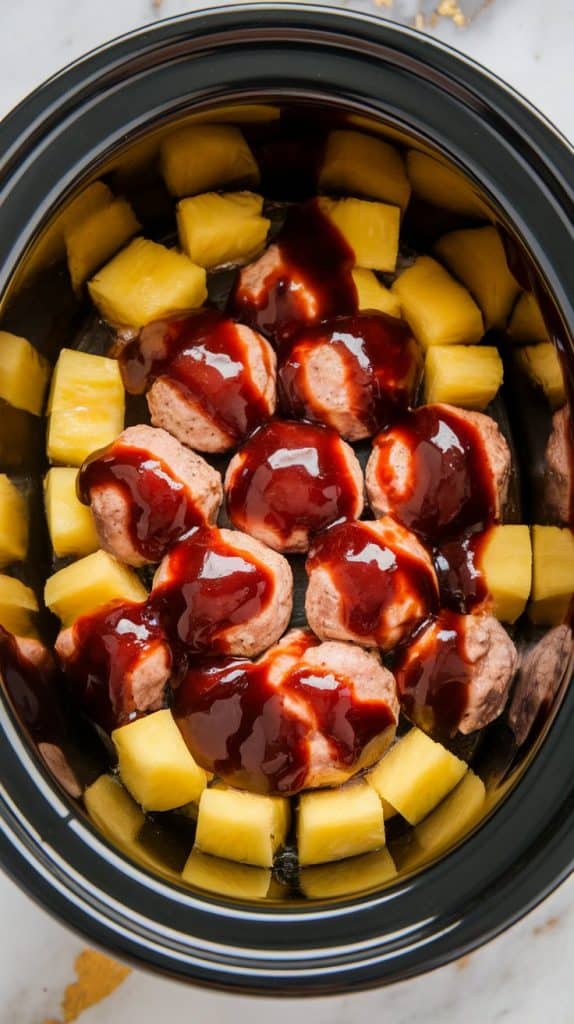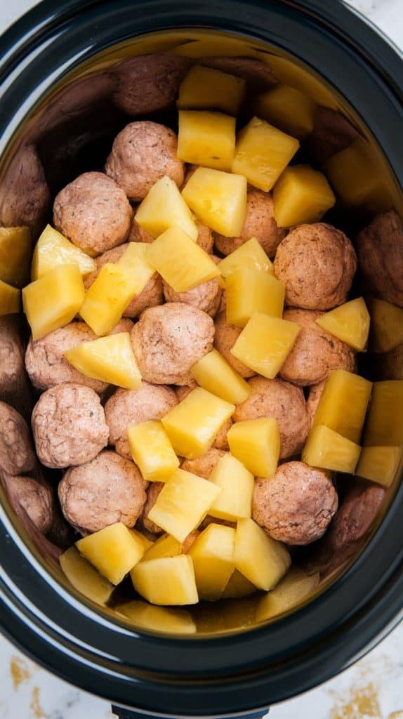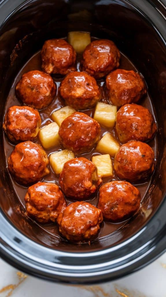The frozen meatballs slowly absorb flavor as they simmer. Pineapple juice acts as a tenderizer and natural sweetener. Barbecue and sweet chili sauce thicken into a sticky glaze, and soy sauce gives just the right salty balance. The slow cooker allows all the flavors to meld over time without drying out the meatballs.