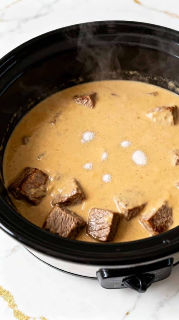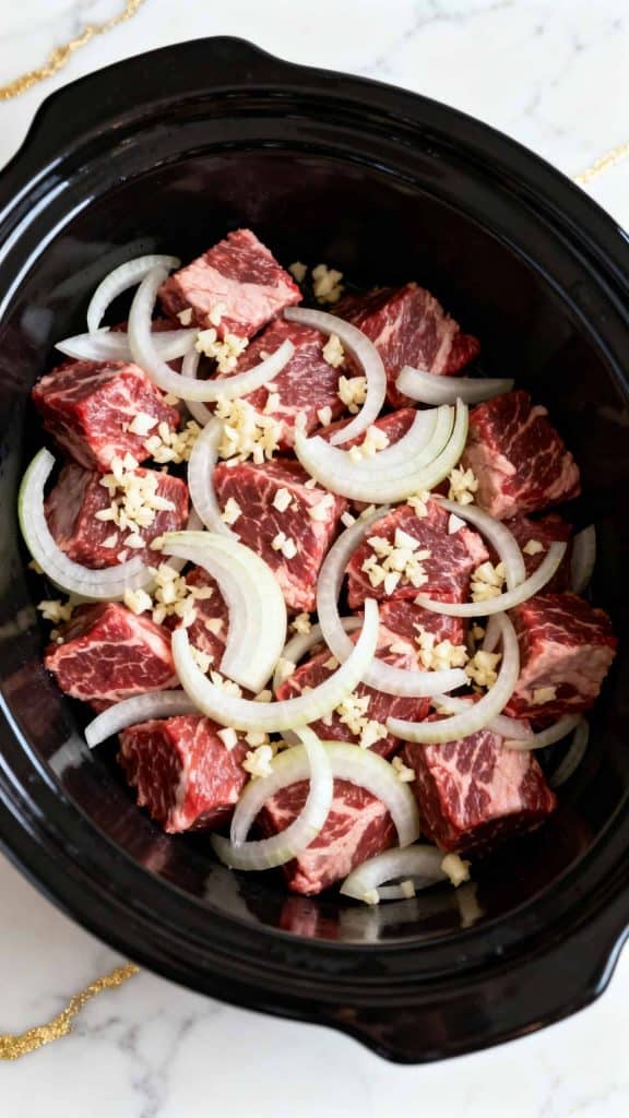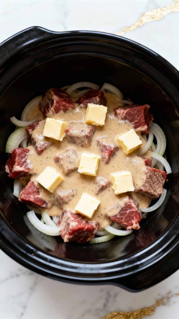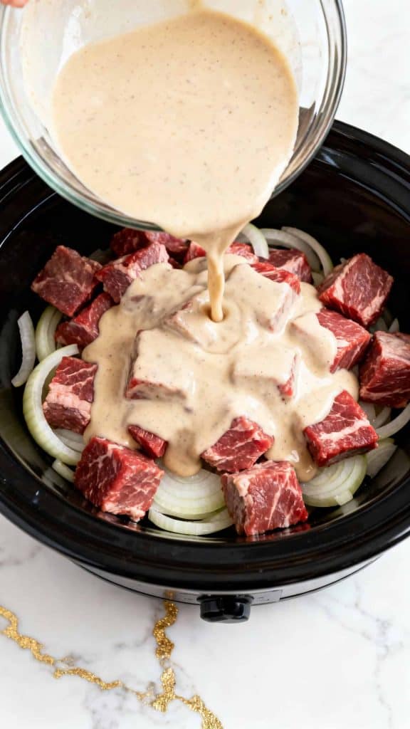 Pour the mixed gravy over the steak, onions, and garlic in the crockpot.
