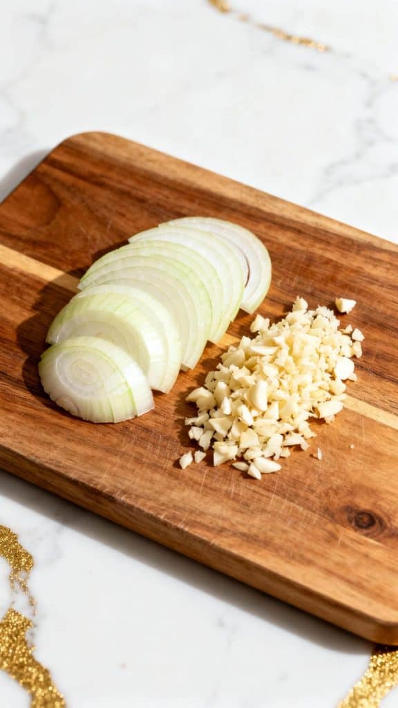 Thinly slice 1 small yellow onion and mince 3 cloves of garlic.