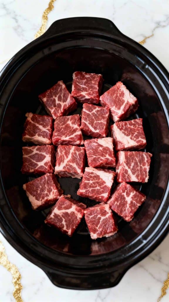 Place 2 lbs of cube steak in the bottom of your crockpot.