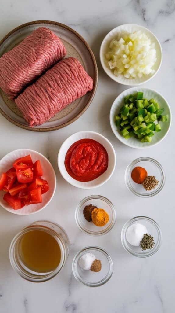 Browning the meat first creates deep flavor. Tomato paste thickens the chili while tomatoes and broth give it body. The slow cooking blends spices into the sauce for a rich, full taste without needing beans for bulk.