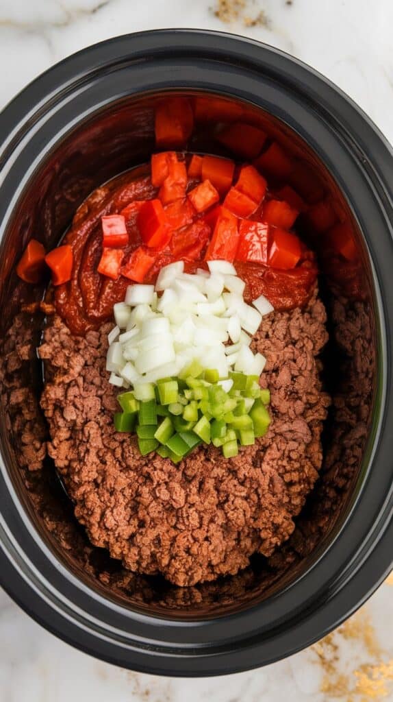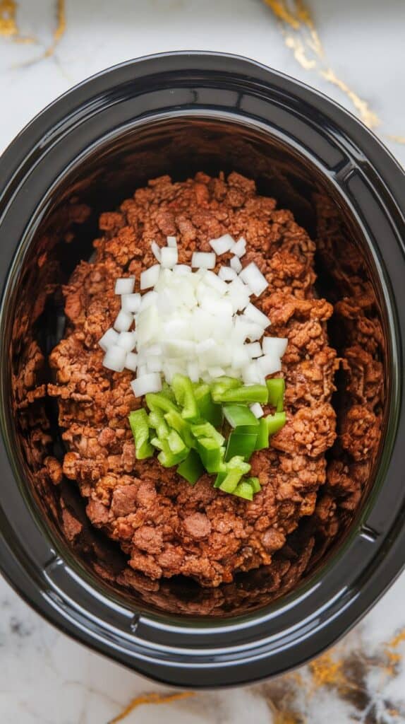 Add the browned meat into the crockpot. Top with 1/2 diced yellow onion and 1/2 diced green bell pepper.