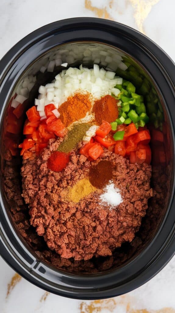 Sprinkle 2 tbsp chili powder, 1 tsp cumin, 1/2 tsp smoked paprika, 1/4 tsp oregano, and a pinch of salt and black pepper into the crockpot.