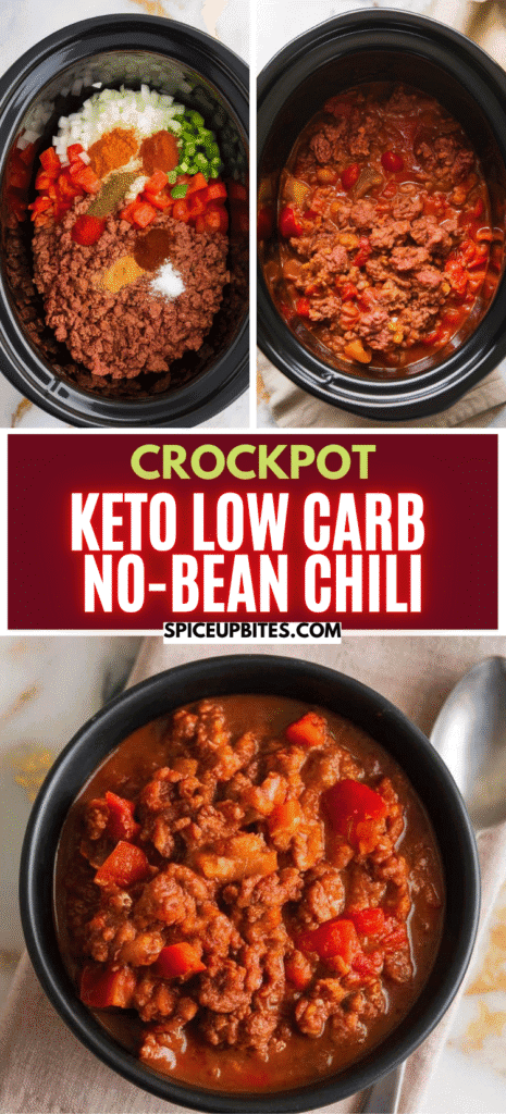 This crockpot keto low carb no-bean chili is the ultimate hearty comfort food with none of the carbs from beans. It’s rich, meaty, perfectly spiced, and simmers all day in the slow cooker so the flavors come together beautifully. You can set it up in the morning and come home to a warm bowl of chili that feels like a hug in a bowl.