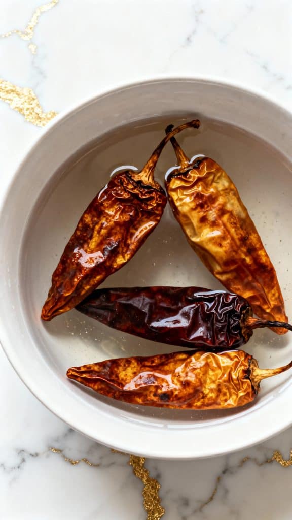 Add the toasted chiles to a bowl and pour boiling water over them. Let them soak for 10 minutes until softened.