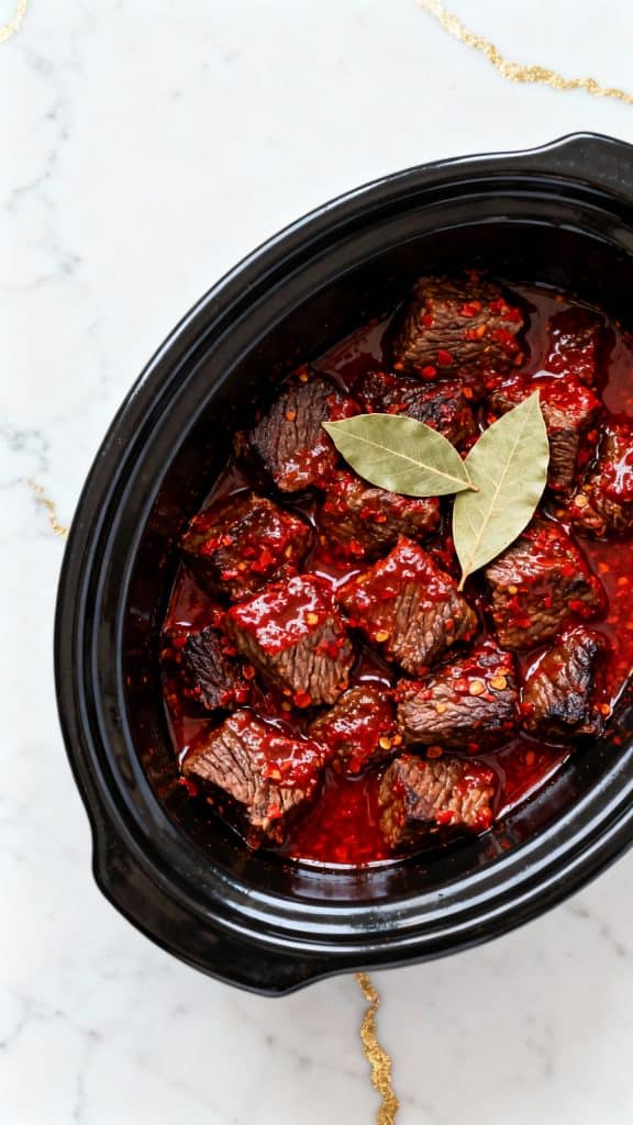 Place the seared beef into the black oval crockpot. Pour the chile sauce over the meat, add 1 more cup of beef broth, and tuck in 2 bay leaves. Cover and cook on low for 8 hours or high for 5–6 hours.