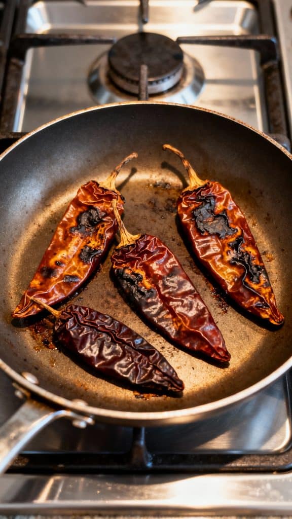 Heat a dry skillet over medium heat. Add 3 dried guajillo chiles and 2 dried ancho chiles (both stemmed and seeded). Toast for about 1-2 minutes, flipping often, until fragrant but not burnt.
