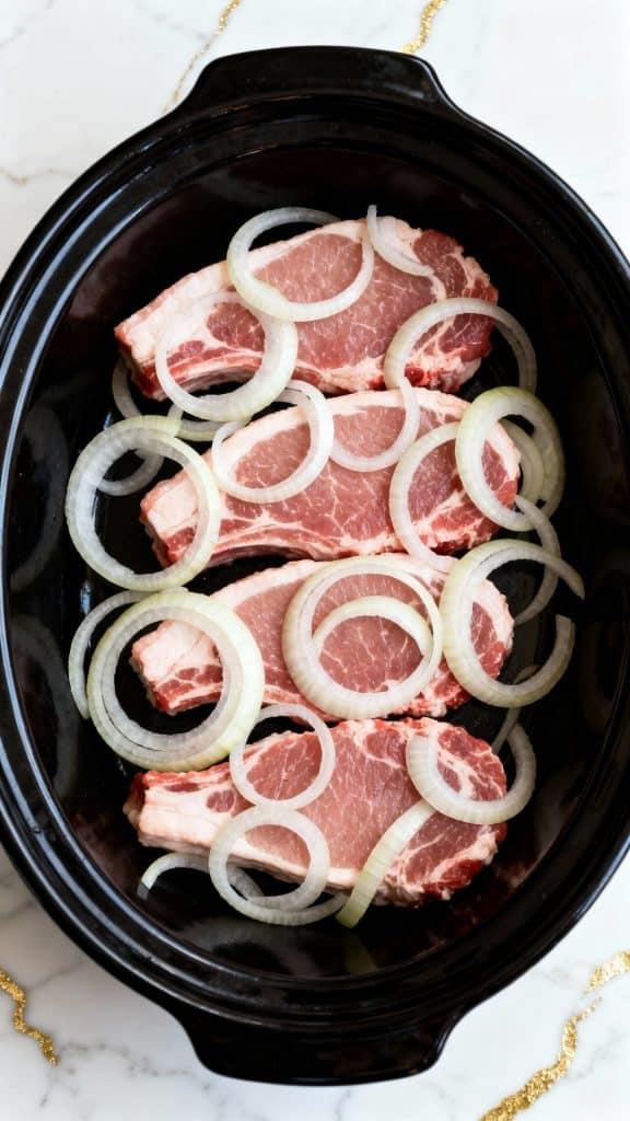 Place 4 boneless pork chops (about 1-inch thick) into the bottom of the black oval crockpot. Top evenly with ½ small onion, thinly sliced.