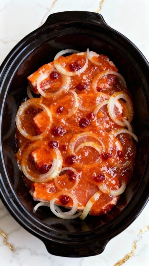 Pour the prepared sauce evenly over the pork chops and onions in the crockpot.