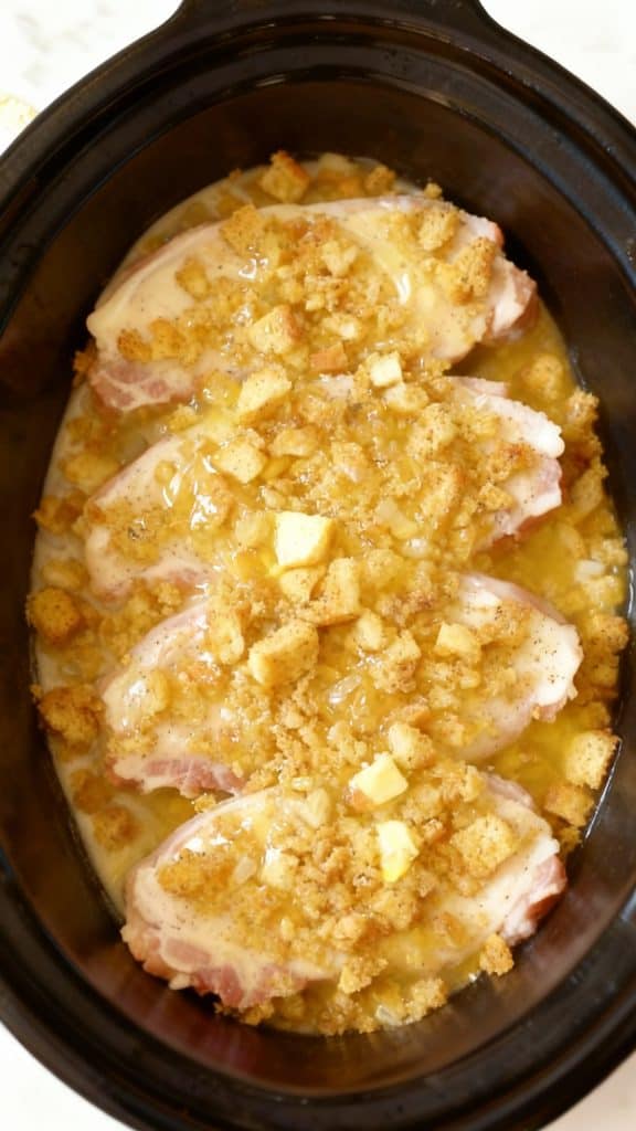 Cover and cook on LOW for 6 hours or HIGH for 3 hours, until pork is cooked through and stuffing is soft.