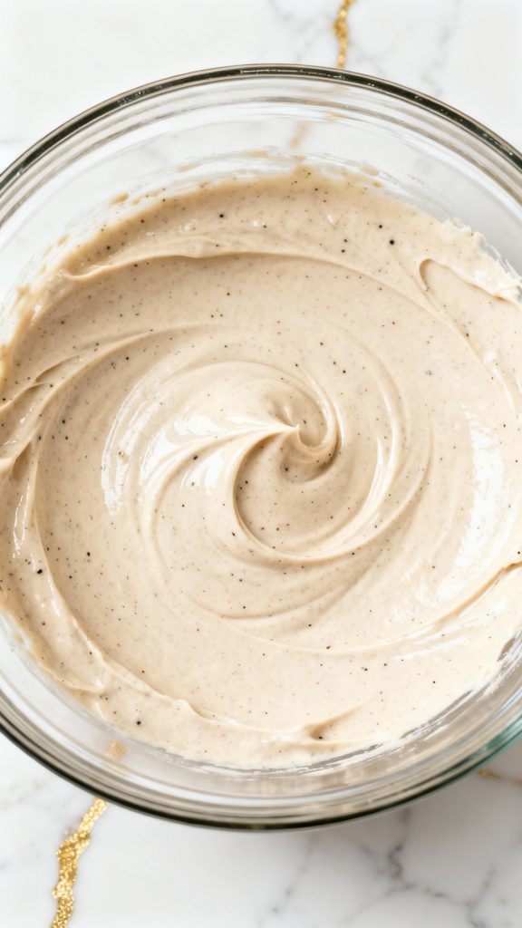 In a mixing bowl, stir together 1 (10.5 oz) can cream of mushroom soup, ½ cup sour cream, ½ teaspoon garlic powder, and ½ teaspoon black pepper until smooth.
