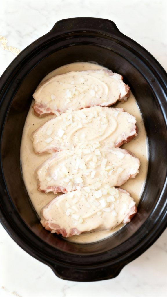 Sprinkle ½ cup diced onion evenly over the soup-covered pork chops.