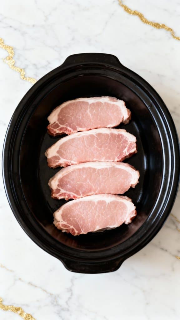 Place 4 boneless pork chops in the bottom of the black oval crockpot, laying them flat in a single layer.
