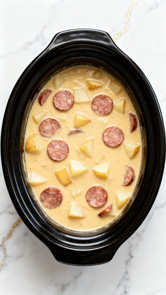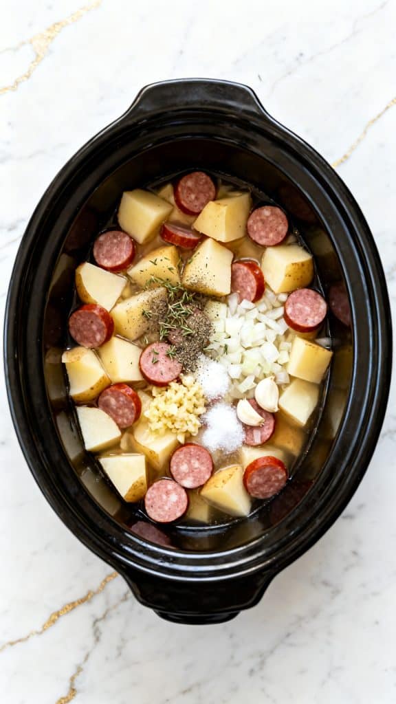 Place 2 pounds diced russet potatoes, 1 pound sliced smoked sausage, 1 small diced onion, and 3 cloves minced garlic into the black oval crockpot. Pour in 4 cups chicken broth. Add 1 teaspoon salt, ½ teaspoon black pepper, and 1 teaspoon dried thyme. Stir gently to combine.