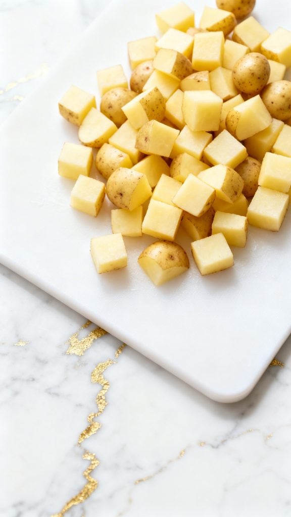 Wash and cut 1 1/2 pounds baby potatoes into 1-inch cubes (about 4 cups). Try to keep them close to the same size so they cook evenly.