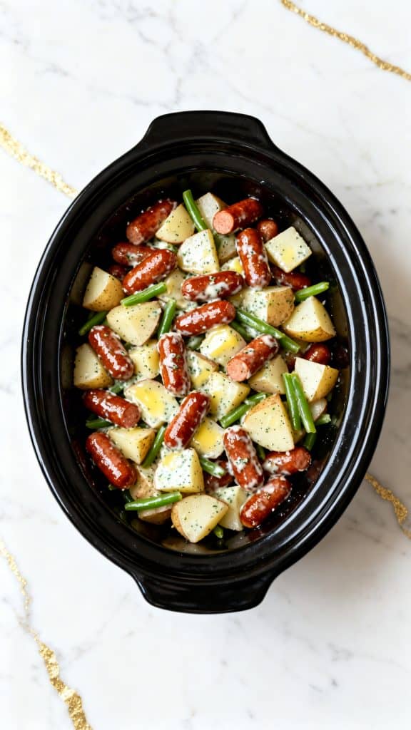 The first time I made this, I had almost nothing planned for dinner. I had a pack of lil smokies in the fridge, a bag of potatoes, and some green beans. I tossed it all in the crockpot with ranch seasoning and butter and hoped for the best. A few hours later, the house smelled amazing. It turned into one of those meals everyone goes back for seconds.
