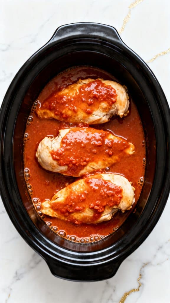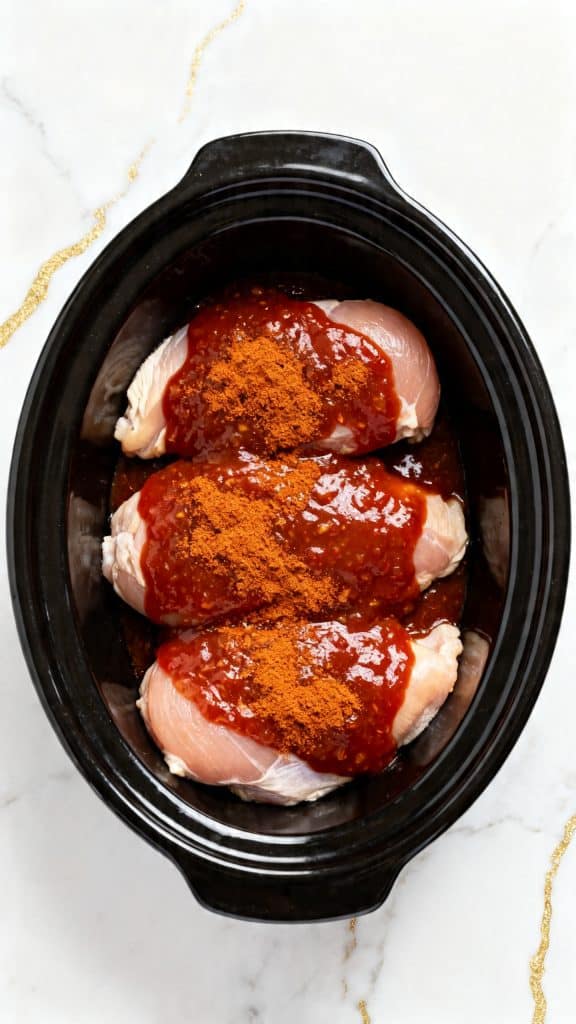 Step 1: Add the chicken and sauce to the crockpot