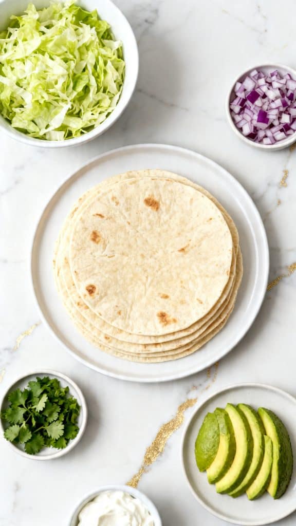 Warm 8 small flour tortillas until soft and pliable. While they warm, get your toppings ready: 1 cup shredded Mexican-blend cheese, 1 cup shredded lettuce, 1/2 cup diced red onion, 1/4 cup chopped cilantro if using, 1/2 cup sour cream if using, and 1 sliced avocado if using.