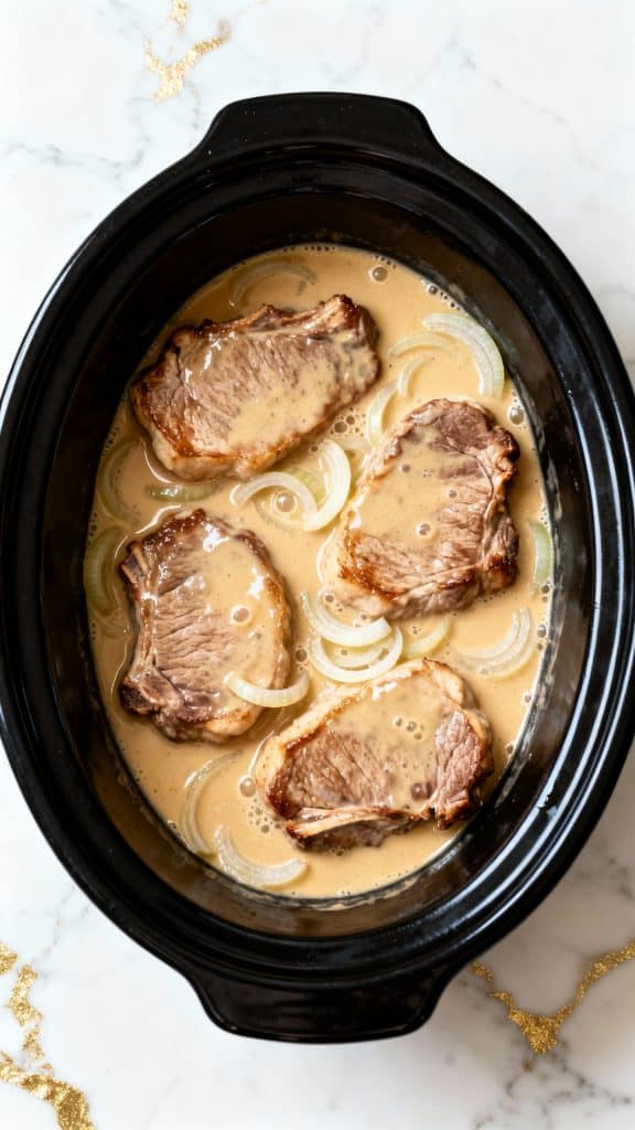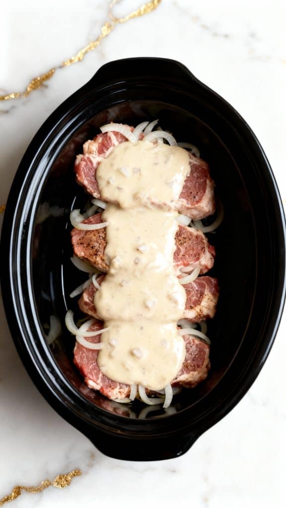 Pour the gravy mixture evenly over the pork chops and onions in the crockpot, covering them completely.