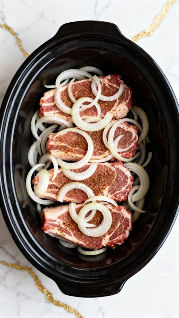 Step 3: Place Pork and Onions in Crockpot