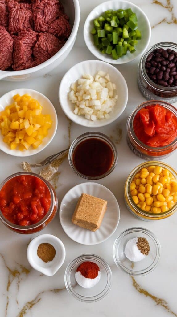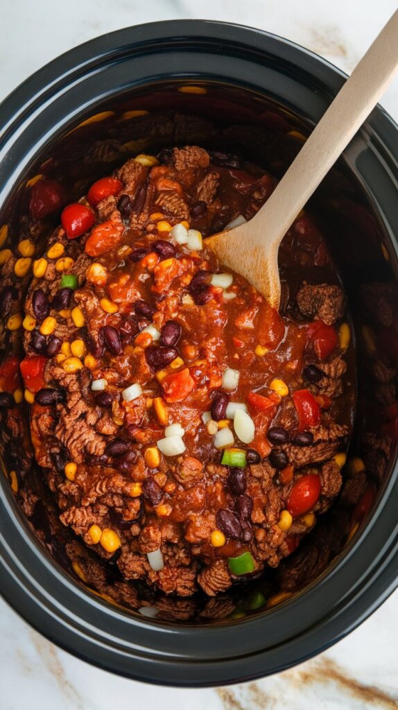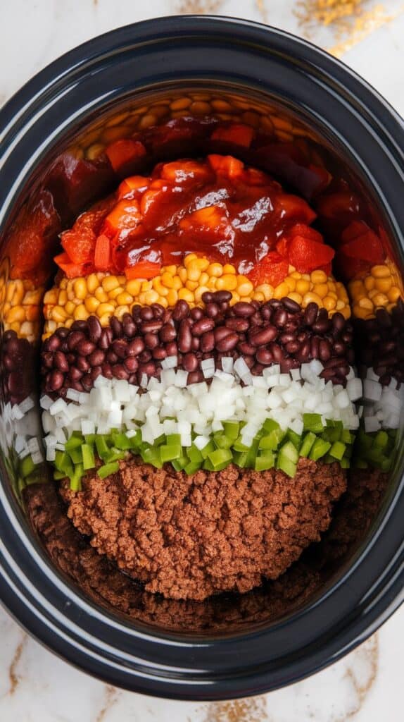 To the crockpot, add the cooked beef, 1 diced yellow onion, 1 diced green bell pepper, 1 can (15 oz) kidney beans (drained and rinsed), 1 can (15 oz) black beans (drained and rinsed), 1 can (15 oz) corn (drained), 1 can (14.5 oz) diced tomatoes with juice, 1 cup BBQ sauce, 1/4 cup brown sugar, 1 tbsp chili powder, 1 tsp smoked paprika, 1/2 tsp garlic powder, and salt and pepper to taste.