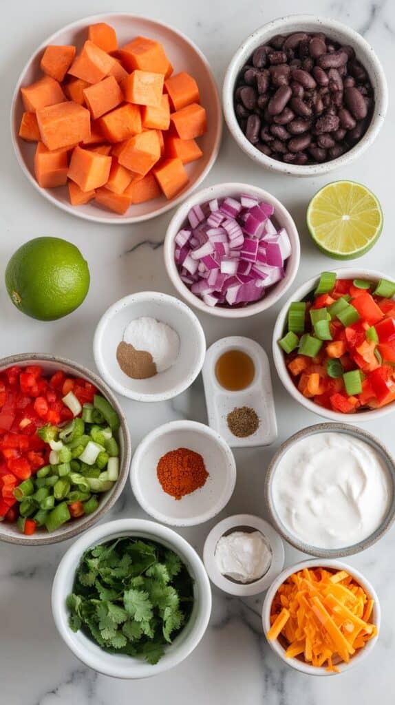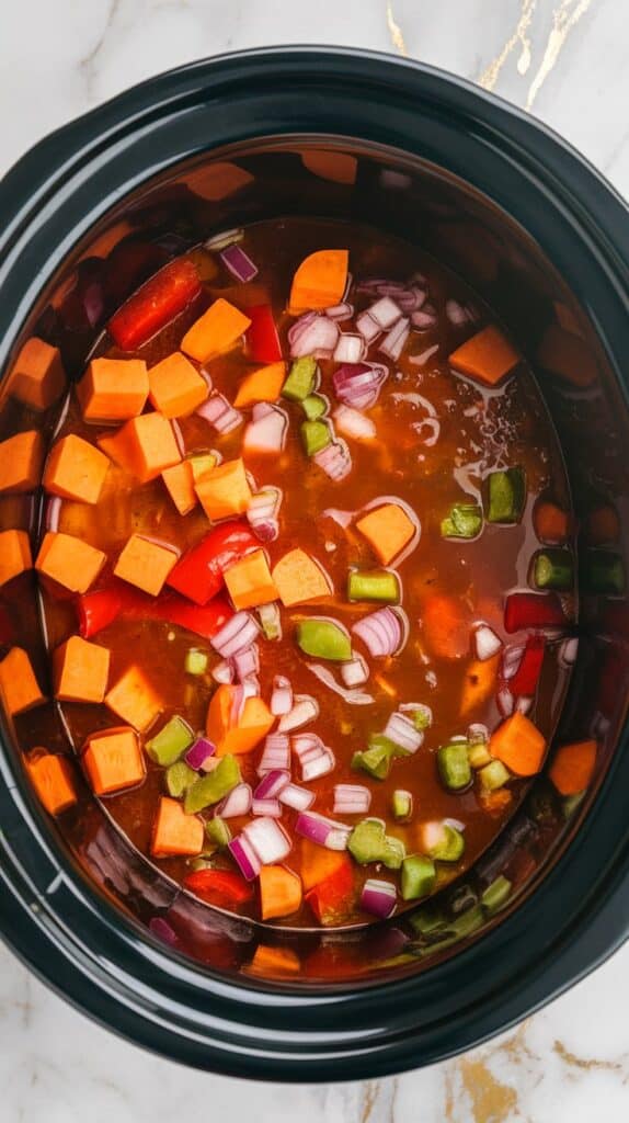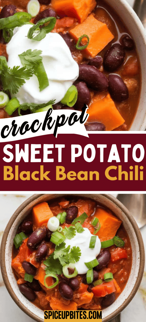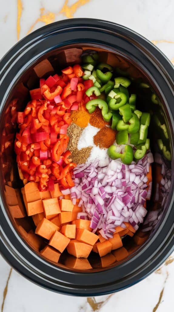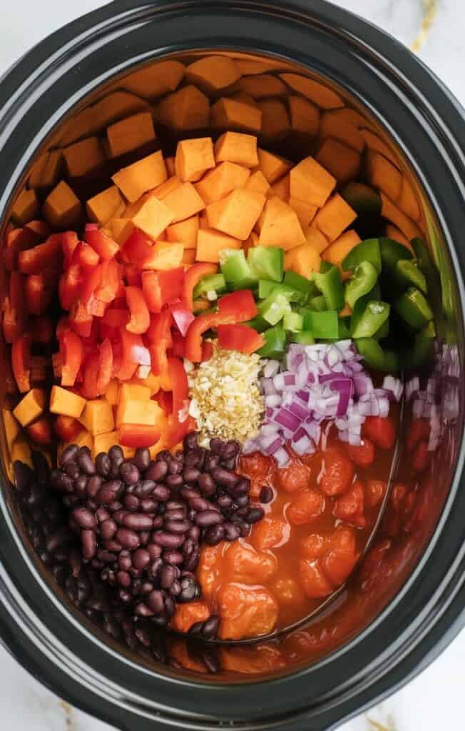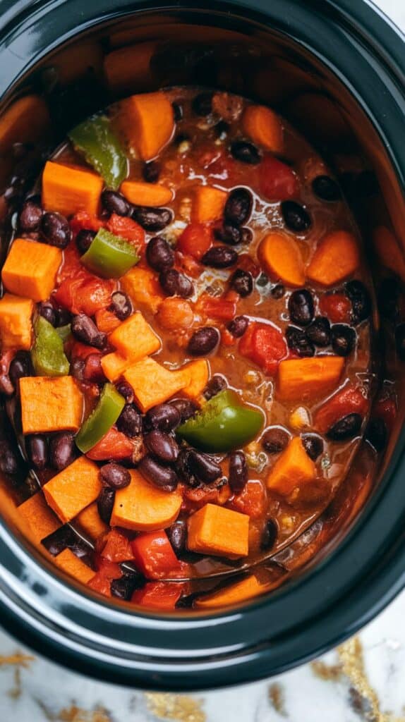The slow cooking allows the sweet potatoes to break down just enough to thicken the chili naturally, without needing flour or cornstarch. Black beans add protein and texture, while fire-roasted tomatoes give a deep, smoky flavor that usually takes hours to develop on the stove.
