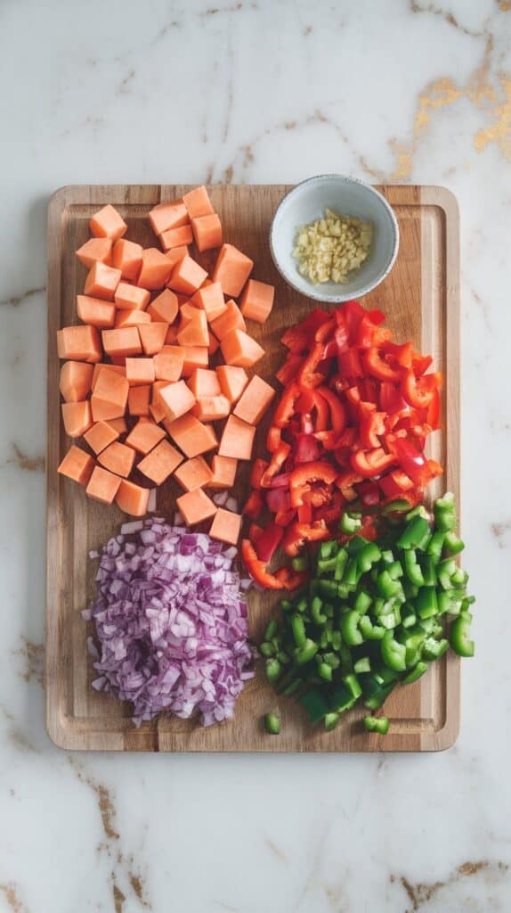Peel and dice 2 large sweet potatoes (about 4 cups). Dice 1 red bell pepper, 1 green bell pepper, and 1 small red onion. Mince 3 garlic cloves.