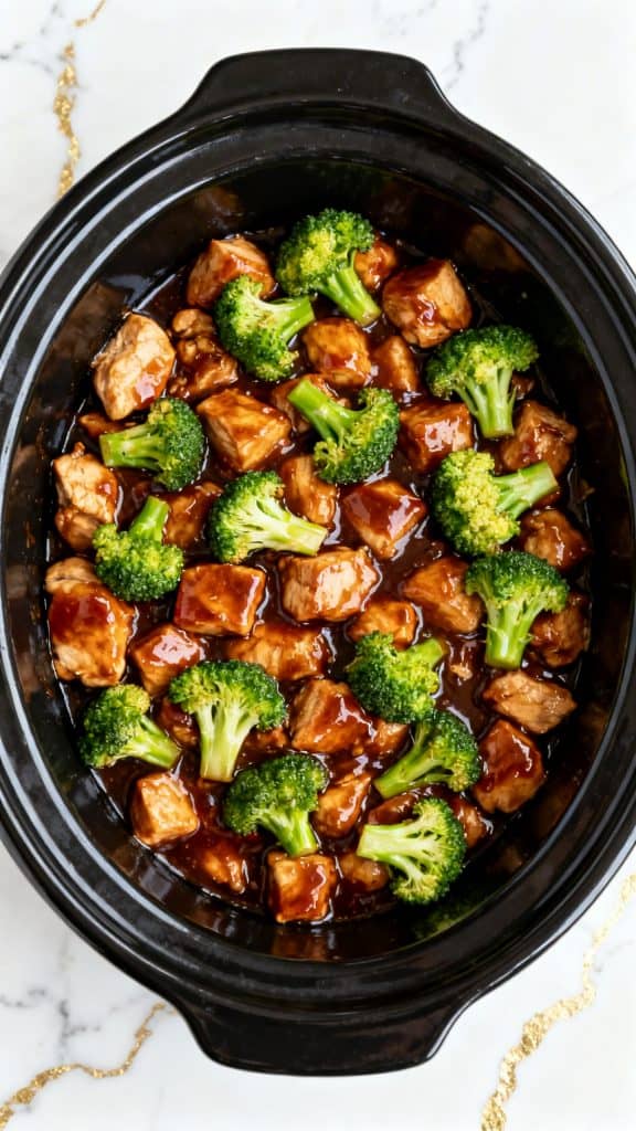 Add 2 cups fresh broccoli florets on top of the thickened saucy chicken cubes. Cover and cook on HIGH for 20–30 minutes until broccoli is tender and bright green.