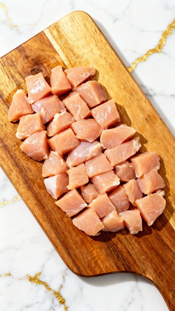 Place 2 pounds raw boneless skinless chicken breasts on a cutting board. Cut them into 1-inch cubes using a sharp knife. The chicken should be evenly sized raw cubes.